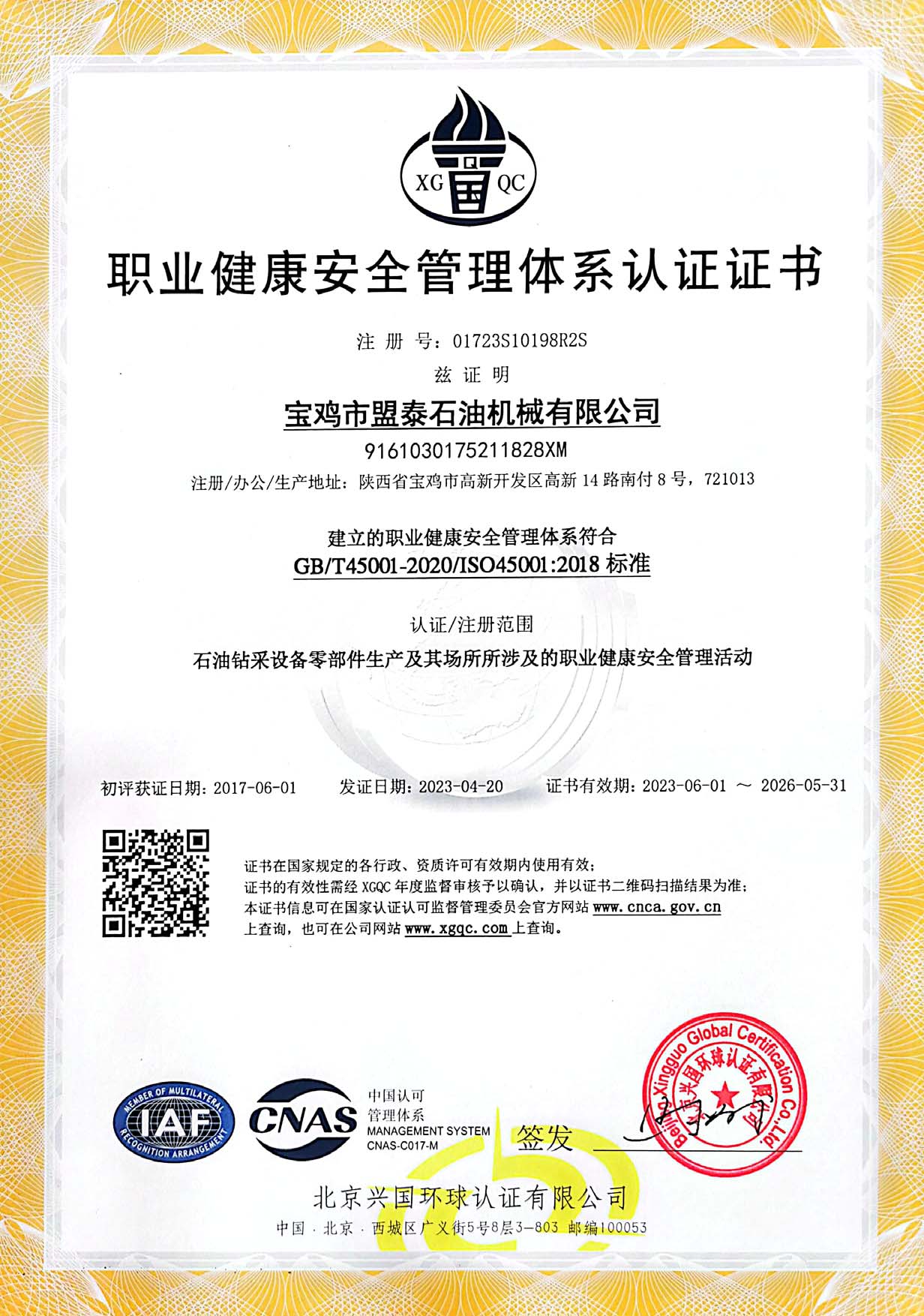 職業(yè)健康安全認(rèn)證證書(shū)